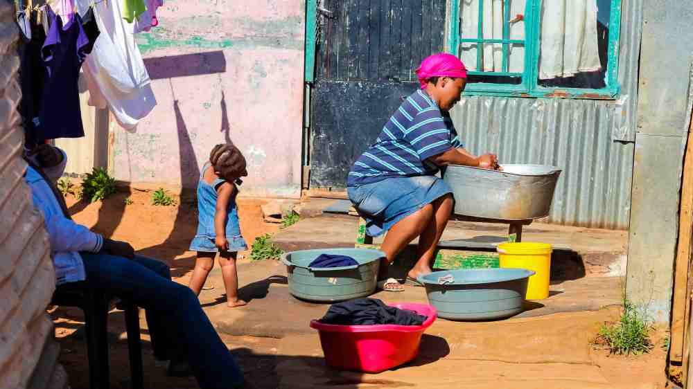 Johannesburg, South Africa, September 11, 2011, African mother and child washing clothes in Low-income Soweto neighborhood