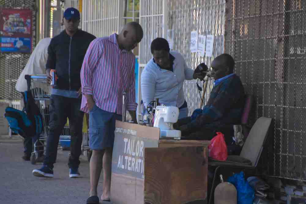 Johannesburg , Gauteng / South Africa -August 02 2018 : african sidewalk tailor sitting down and speaking to customers morning Rosettenville johannesburg