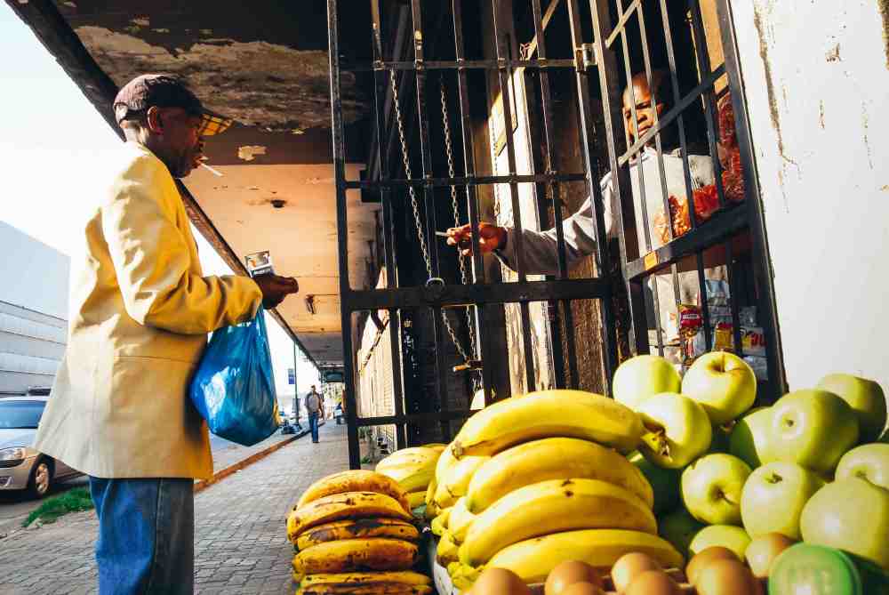 Johannesburg , Gauteng / South Africa -September 11 2018 : mae customer outside a spaza shop purchasing loose cigarette fruits in the foreground midday Johannesburg City